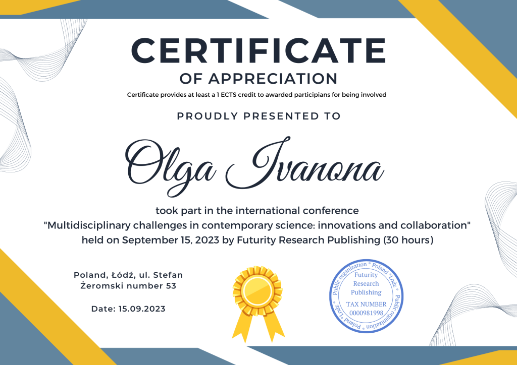 ✓ Электронный сертификат участника тезисов на котором указано количество часов и кредитов ECTS