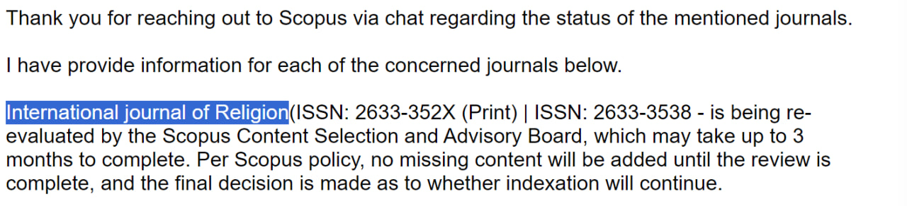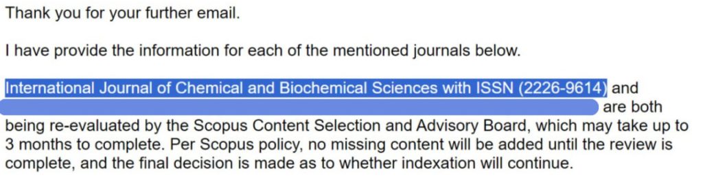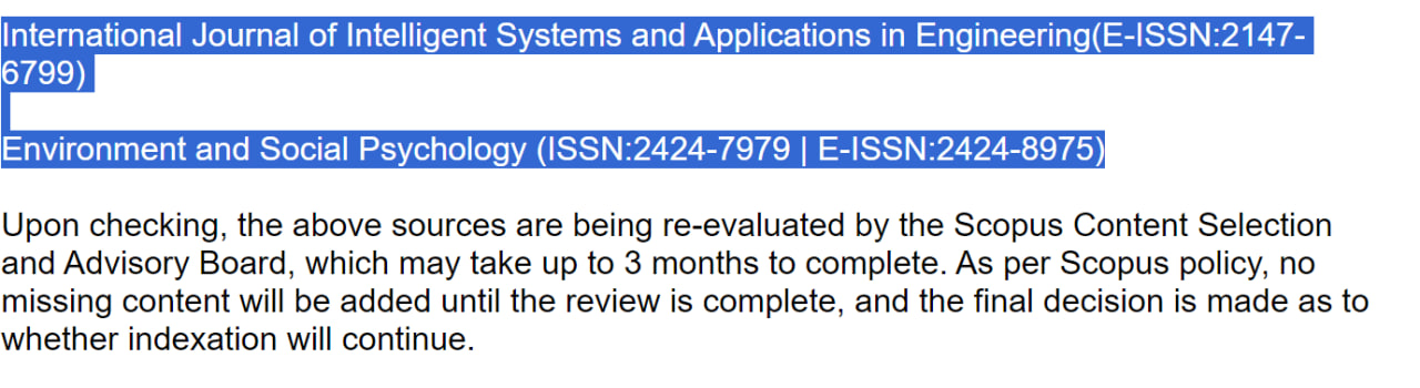 Большая часть журналов, о которых мы писали ранее, уже находятся под проверкой в базе Scopus. Это означает, что их контент будет переоценен CSAB (Консультативным советом по вопросам отбора контента Scopus), и пока проверка длится, статьи не будут индексироваться. Академия статей на основе собственного опыта может с уверенностью сказать, что все эти журналы будут исключены из базы Scopus