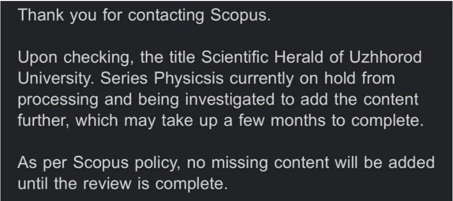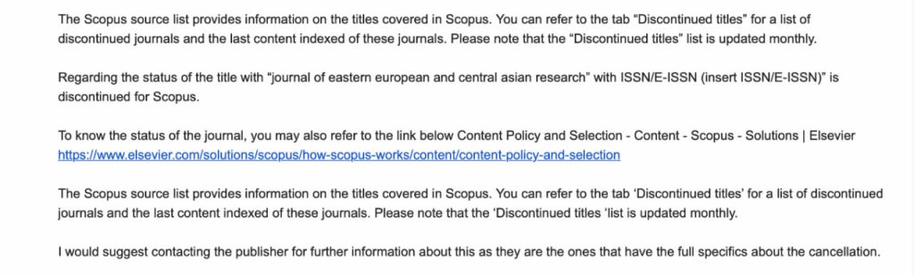 В настоящее время журнал уже попал в поле зрения Scopus и находится на переоценке. По нашим прогнозам, журнал будет исключён из базы Scopus, а статьи будут деиндексированы со 100% вероятностью до конца 2024 года. Ниже смотрите скриншот с ответом от специалистов Scopus.